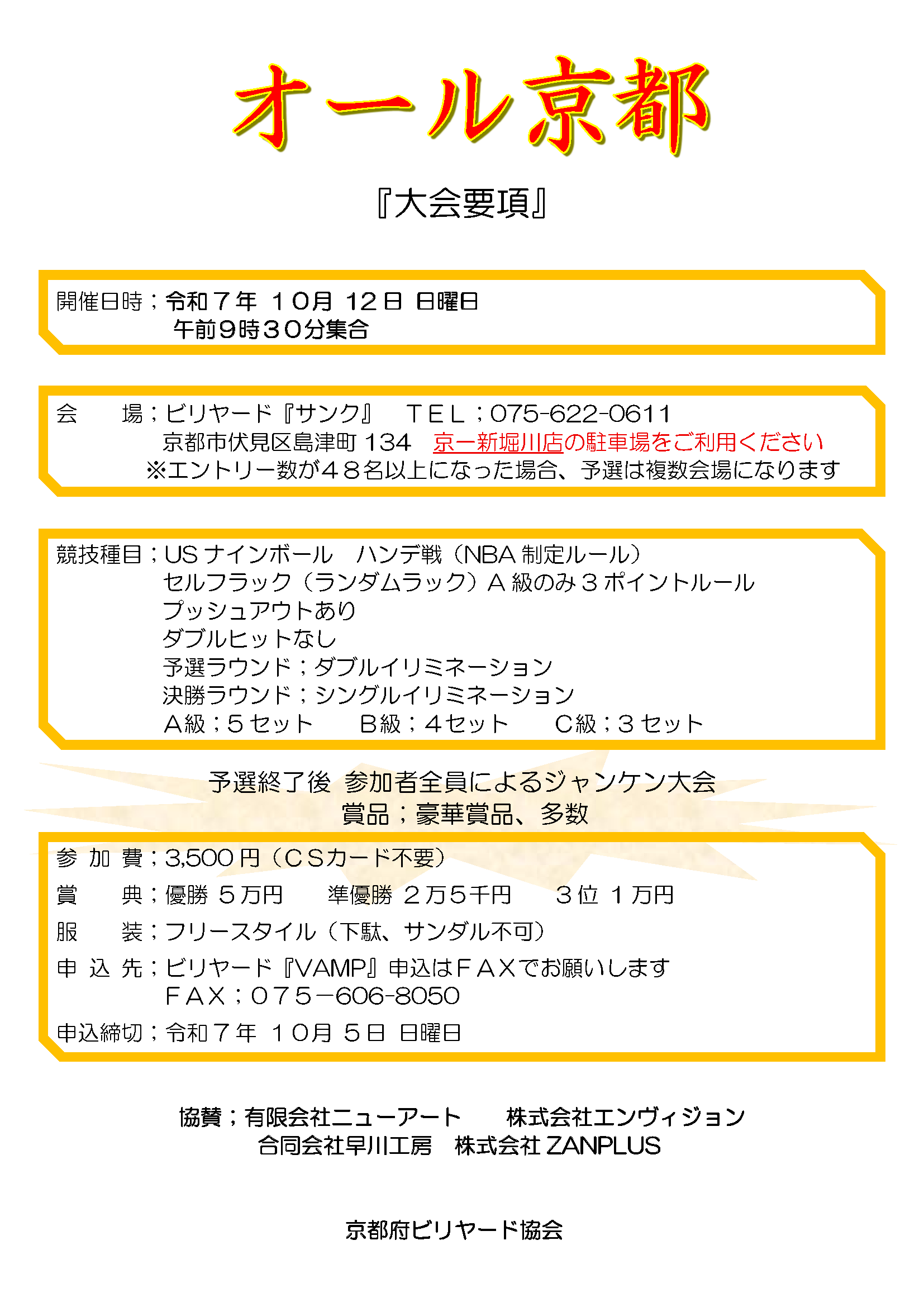 令和7年度オール京都 要項(訂正) 2025年9月25日オール京都, 要項管理者 Tweet 2025/10/02 訂正 ビリヤード『サンク』伏見店への駐車は、京一本店ではなく、 京一新堀川店の駐車場をご利用頂きますよう、お願いいたします。