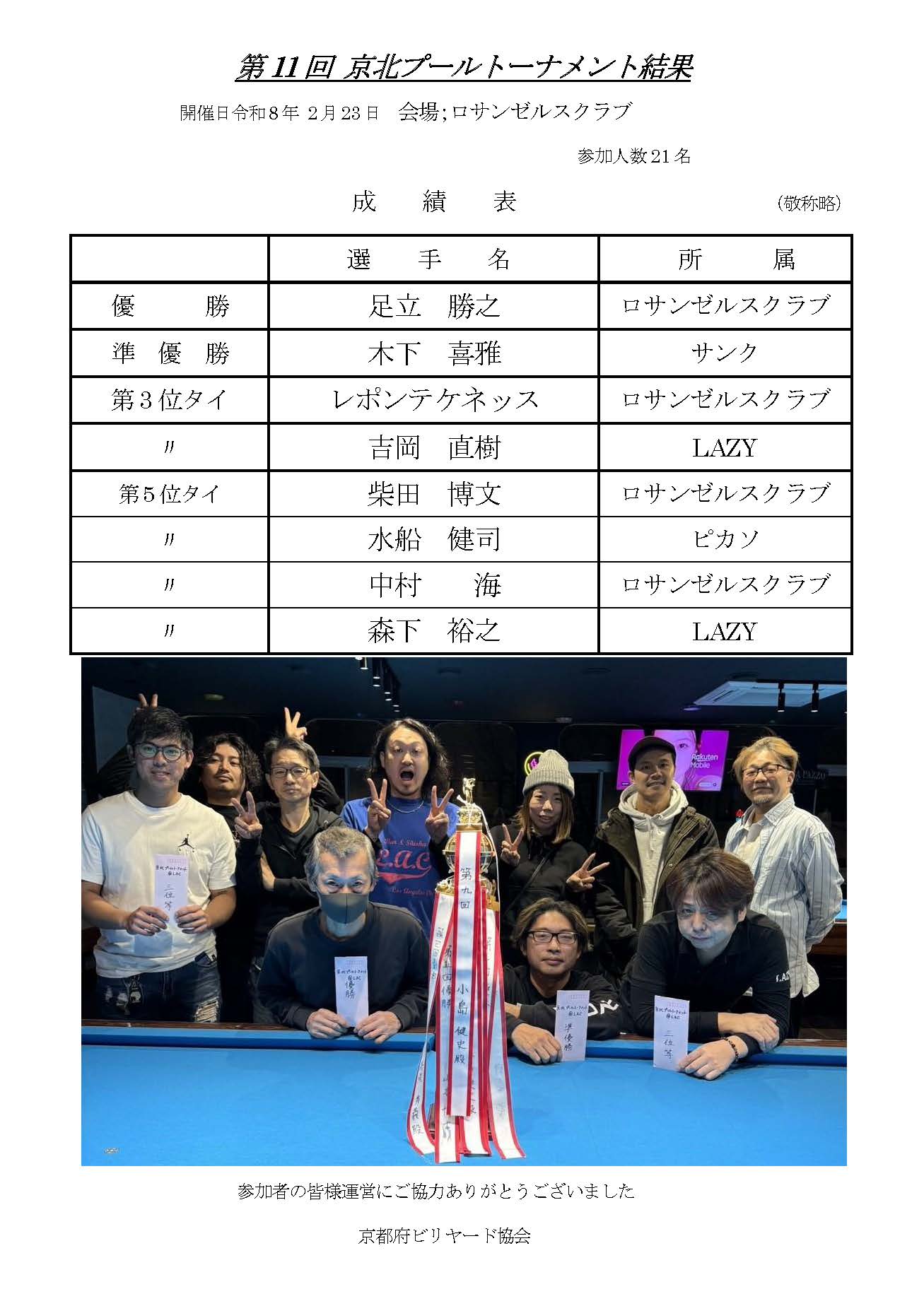 第11回京北プールトーナメント 結果